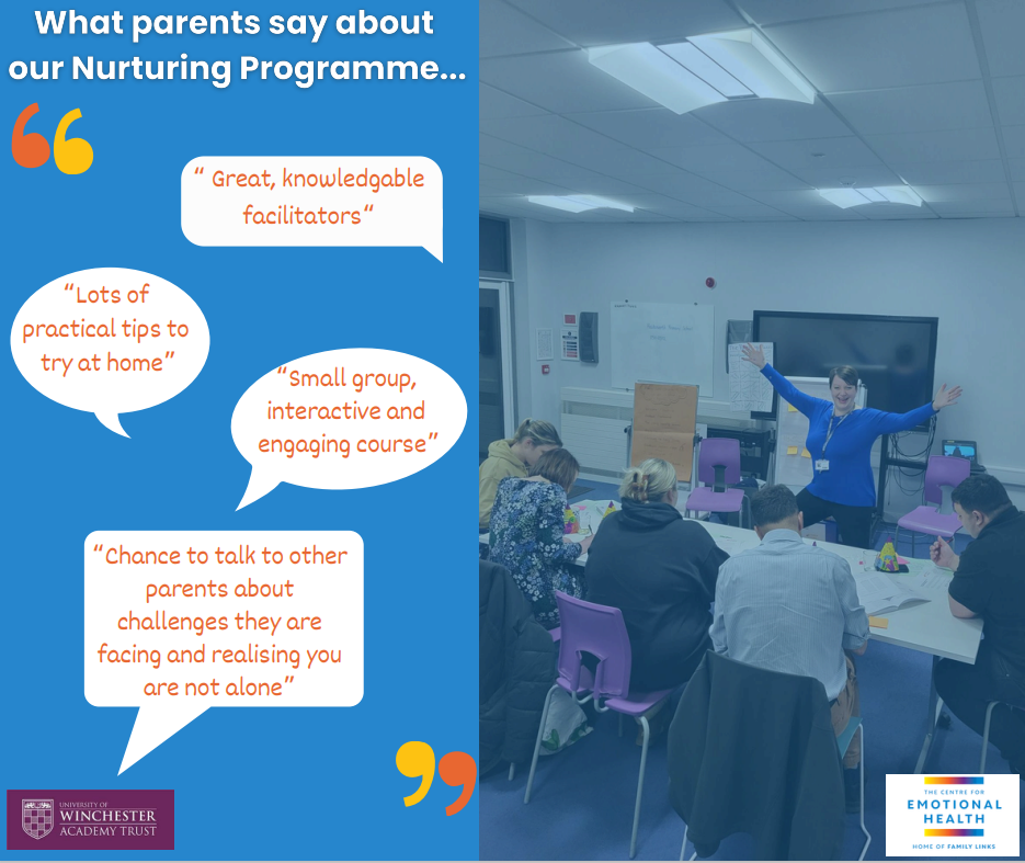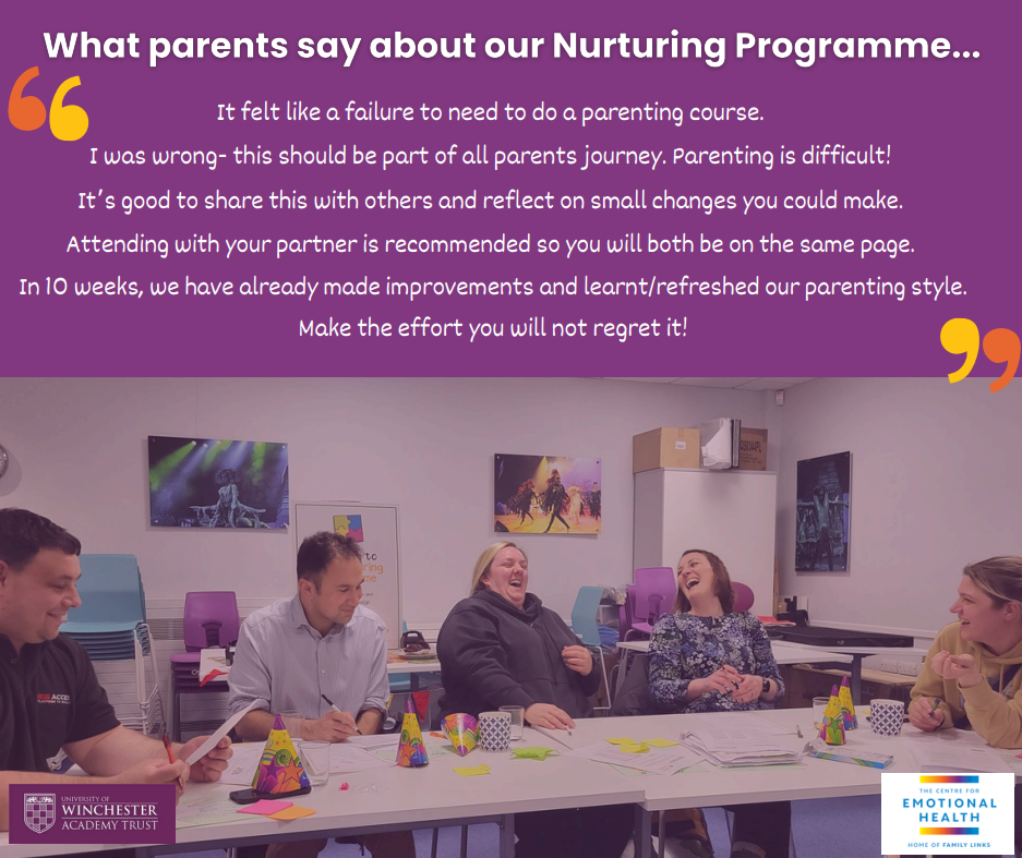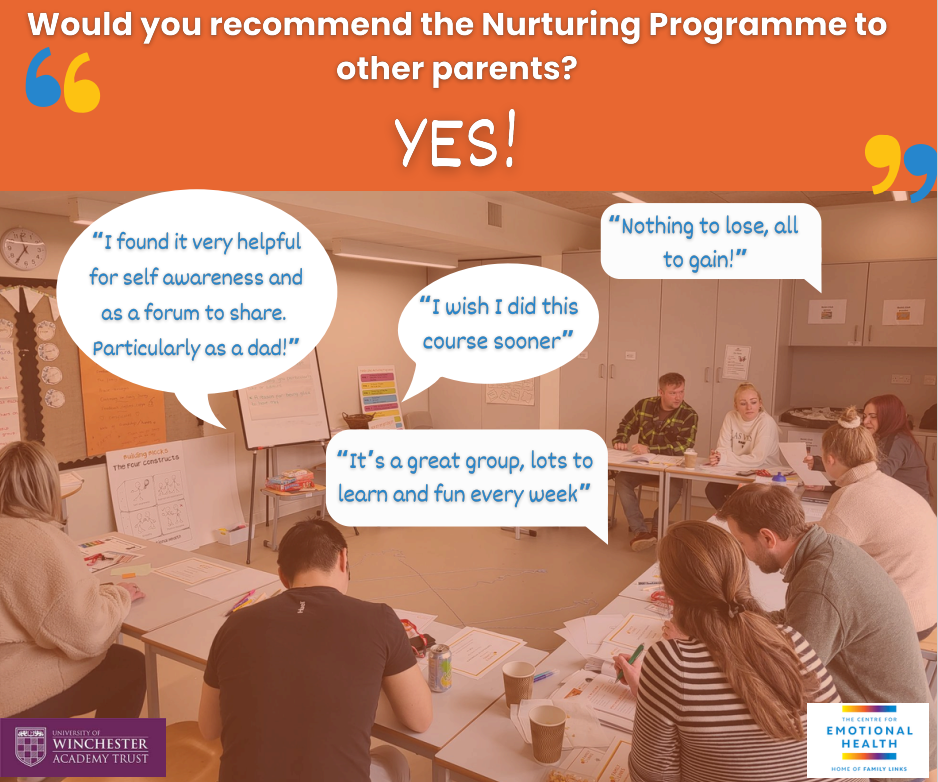 The Nurturing Programme is a 10-week parenting group that aims to empower parents and carers to build positive relationships, encourage co-operative behaviour and develop resilience, empathy and self-esteem in themselves and their children.
